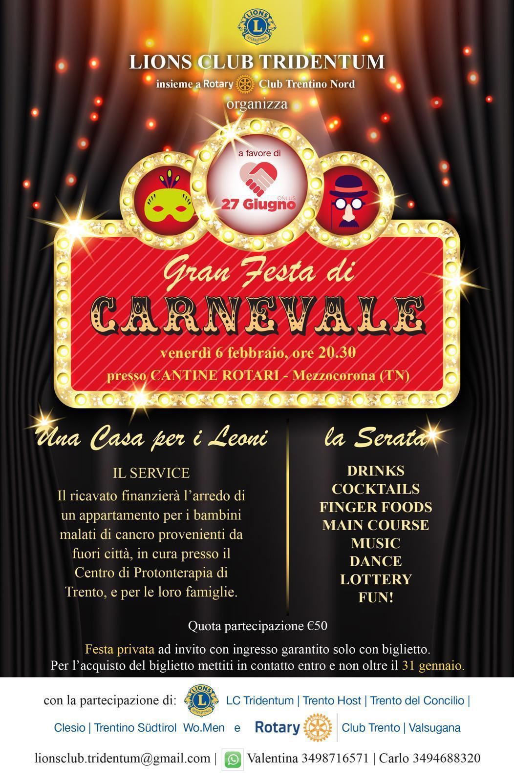 Intercub Festa di carnevale con Rotary Club Trentino Nord e Valsugana presso le Cantine di Mezzacorona, con cena, musica con DJ e grandi balli.